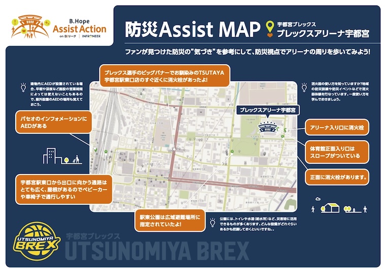 「防災 Assist Map」は、防災 Assist Action on BIリーグの参加者によるコメント投稿を元に、専門家の監修により作成しました。Bリーグの試合会場に向かう道中や日常生活の中で、地域防災や避難の視点から街を観察し気づいた点を地図上にまとめています。 2024-25シーズンは、B1リーグ24クラブ、B2リーグ14クラブの計38クラブで地域ごとの「防災 Assist Map」が完成しました。試合会場周辺地域の防災情報を、ぜひチェックしてみてください!